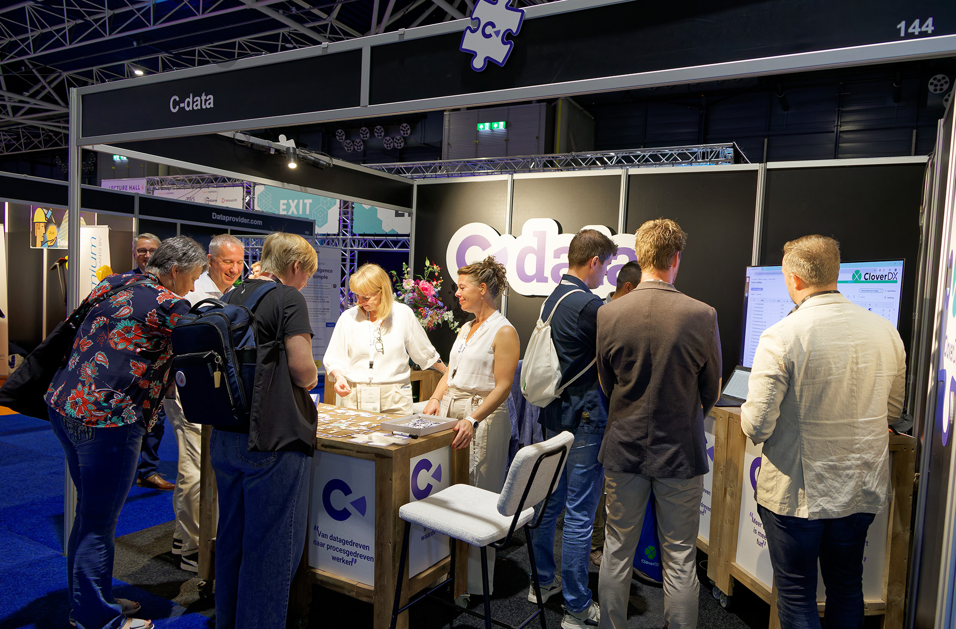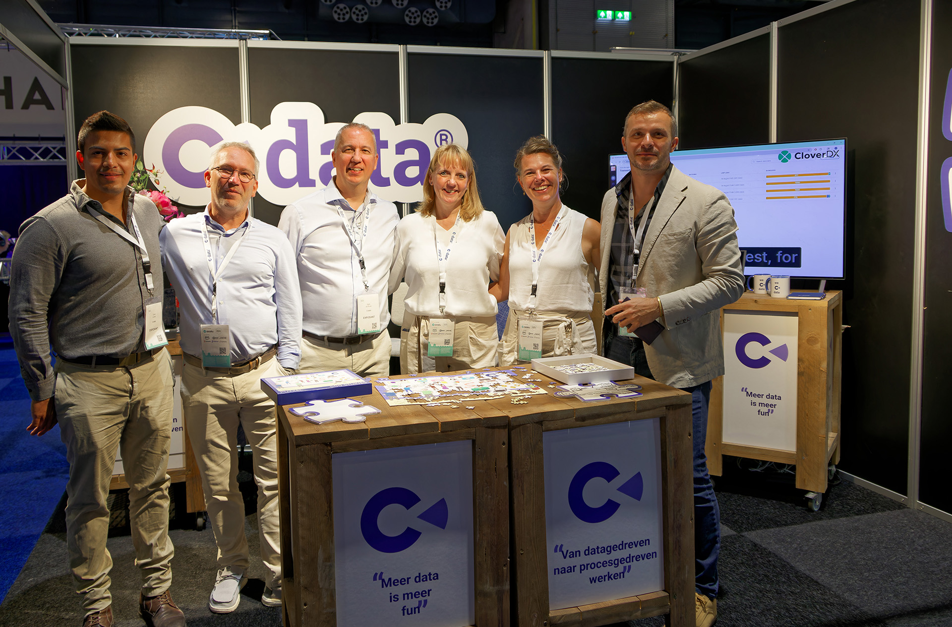 Uit dat proces ontstond het beursconcept. “Wij maken processen aan elkaar,” zegt Mark. “Leggen de ontbrekende stukjes op hun plek. We puzzelen het in elkaar.” De puzzel werd daarom het centrale thema van de stand, in de visuals en als goodie. Bezoekers konden letterlijk meepuzzelen op de stand, een speelse vertaling van wat C-data doet.